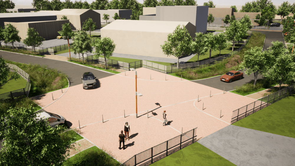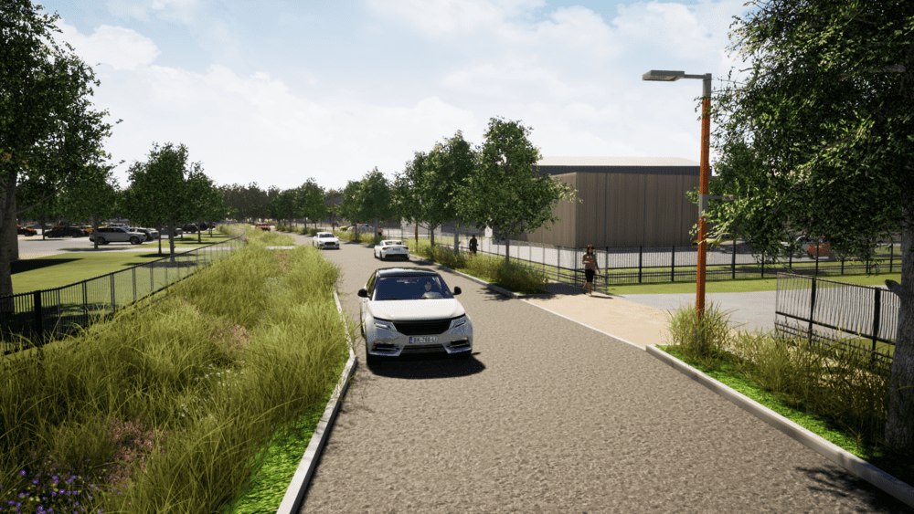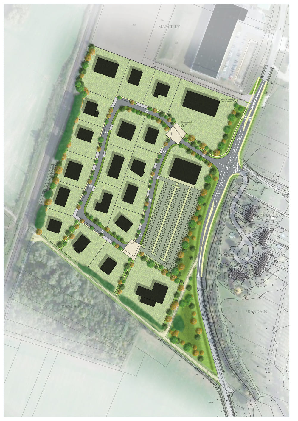 Les espaces verts accompagnent le développement du projet et qualifient la façade en front de la route départementale. De nombreux arbres sont plantés pour améliorer le paysage de l’entrée de ville et de la frange urbaine, ou pour intégrer le projet avec la voie ferrée voisine.